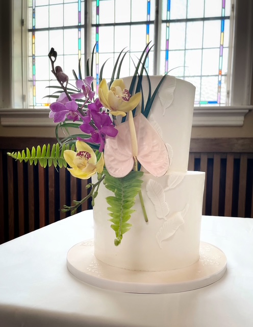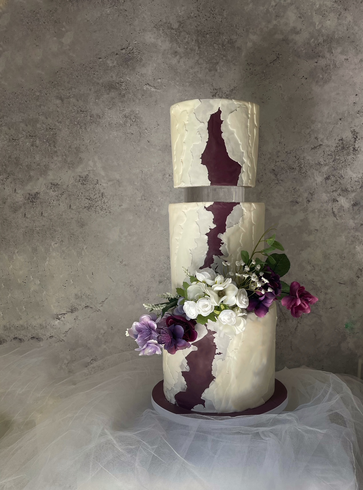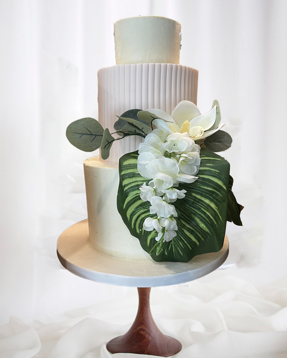 Embossed Fondant Wedding Cake with simple flower arrangement