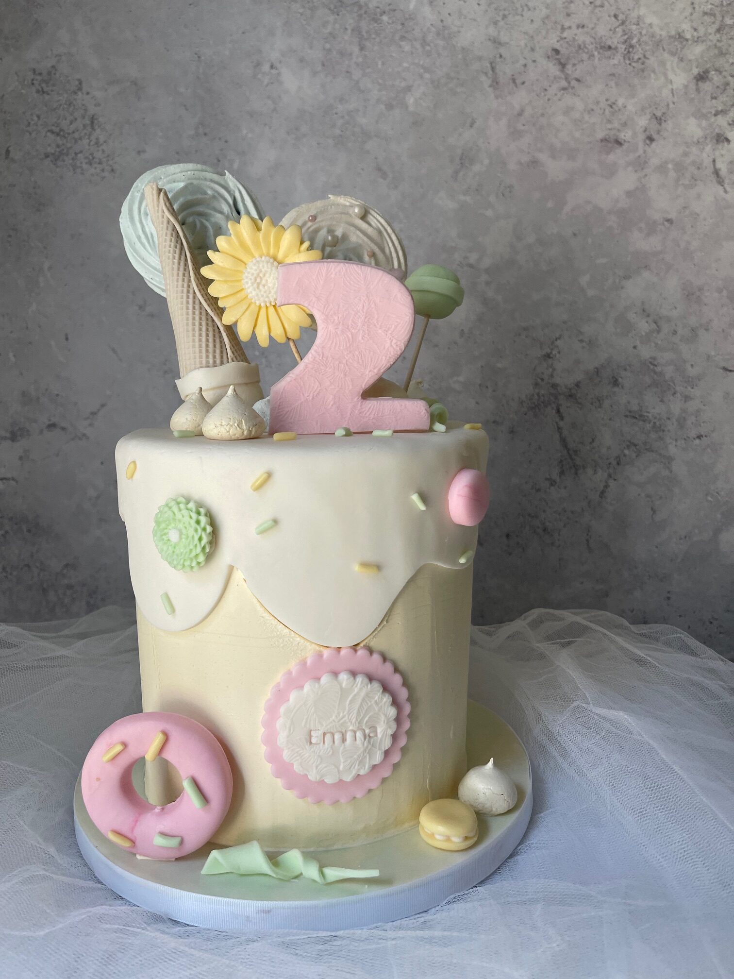 Feminine hues for this birthday cake. Light orange and pink hues with edible fondant images with custom wafer paper prints